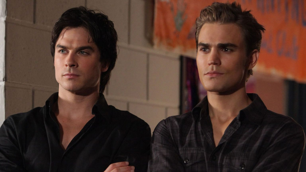 THE VAMPIRE DIARIES Pictured (L-R): Ian Somerhalder as Damon, Nina Dobrev as Elena, and Paul Wesley as Stefan. Image Number: VD4_3Shot_Grey_3174rb.jpg. Photo Credit: Justin Stephens/The CW. © 2012 The CW Network, LLC. All rights reserved.